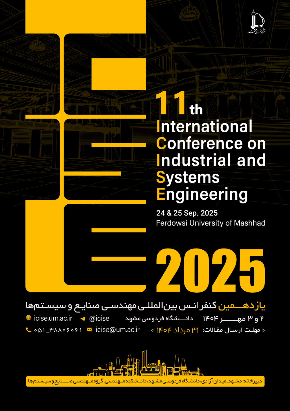 We are pleased to announce that the 11th International Conference on Industrial and Systems Engineering will be held on September 24–25, 2025, both in-person and virtually, organized by the Department of Industrial and Systems Engineering at Ferdowsi University of Mashhad.